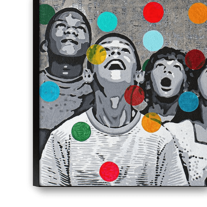 Die schwarz-weißen Kinder stehen für Unschuld und Einfachheit, eine leere Leinwand, unberührt von der Komplexität der Welt. Die bunten Regentropfen symbolisieren die Schönheit, die Vielfalt und den Reichtum des Lebens, sie prasseln auf alles nieder und berühren alles, was sie erreichen. Die Kinder staunen, als sähen sie die Farbe zum ersten Mal, was das Wunder und die Magie des Alltäglichen unterstreicht.