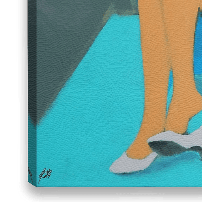 Die Malerei ist im Pop art Stil gemalt, mit starken fröhlichen Farben, die junge Frau mit rosa Haar trägt ein zitronengelbes Oberteil, einen pinkfarbenen kurzen Rock und eine knallige orange Strumpfhose. Mit einem ihrer…