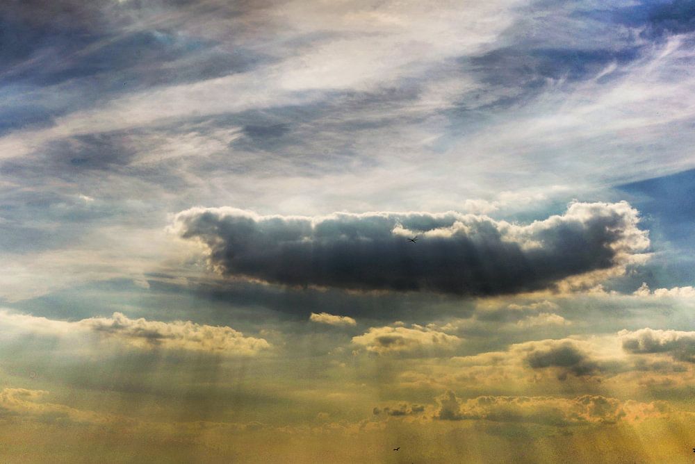 Wolkenpartijen en lichtstralen tijdens een late namiddag op het IJsselmeer