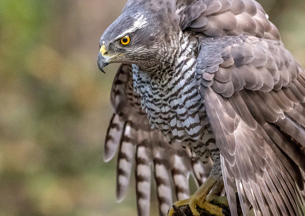 Schöner Habicht (Nordhabicht) auf einer Stange vor einem farbenfrohen Herbsthintergrund. Der Falke hatte sich groß gemacht, um sich vor einem Eindringling zu schützen. Der Habicht (Accipiter gentilis) ist ein Raubvogel, der hauptsächlich mittelgroße Vögel wie Tauben, Elstern und Eichelhäher fängt.