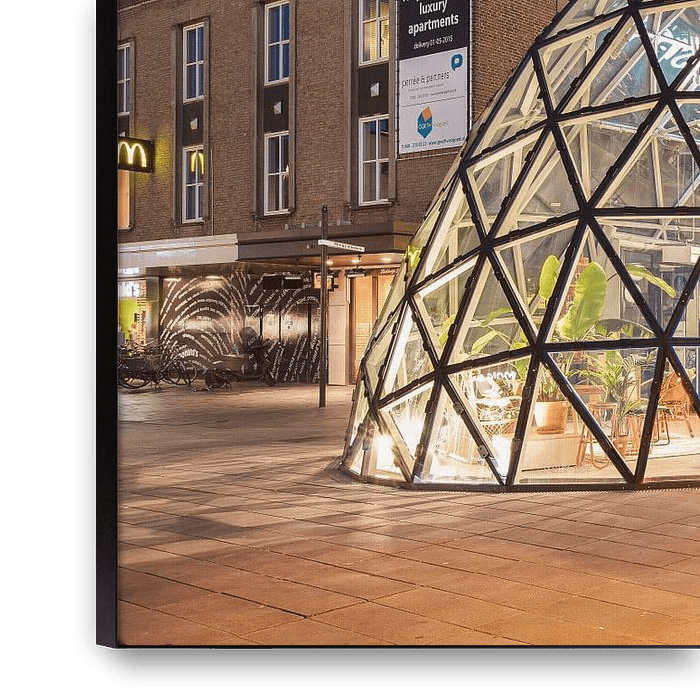 Bestelle dieses moderne Wandbild Iconic Blob Gebäude Eindhoven Stadtzentrum in der Dämmerung 1 von Tony Vingerhoets als Reproduktion auf Leinwand, Alu-Dibond, als Poster, Fototapete oder Acrylglasbild.
