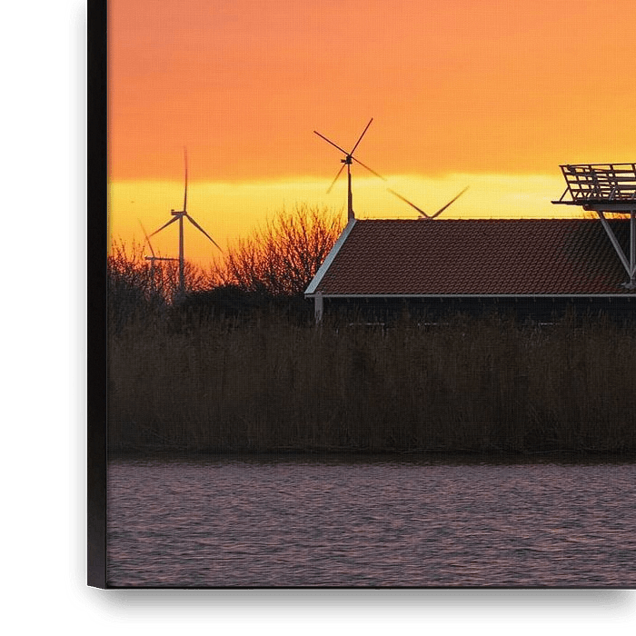 Bestelle das Foto Idyllische Holländermühle am Wasser unter einem goldenen Morgenhimmel von Bram Lubbers als Reproduktion auf Leinwand, Alu-Dibond, als Poster, Fototapete oder Acrylglasbild.