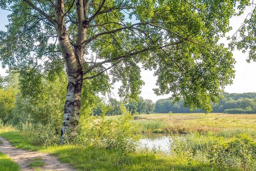 Malerische Landschaft am Rande eines niederländischen Waldes. Entlang des sandigen Weges ist eine Grau-Pappel ein echter Blickfang. Auf der rechten Seite des Bildes befindet sich eine offene Wasserfläche. Es ist noch früh am Morgen an einem sonnigen Sommertag. Das Foto wurde in einem Naturschutzgebiet in der Nähe des Dorfes Halsteren, Gemeinde Bergen op Zoom, Provinz Noord-Brabant, aufgenommen.