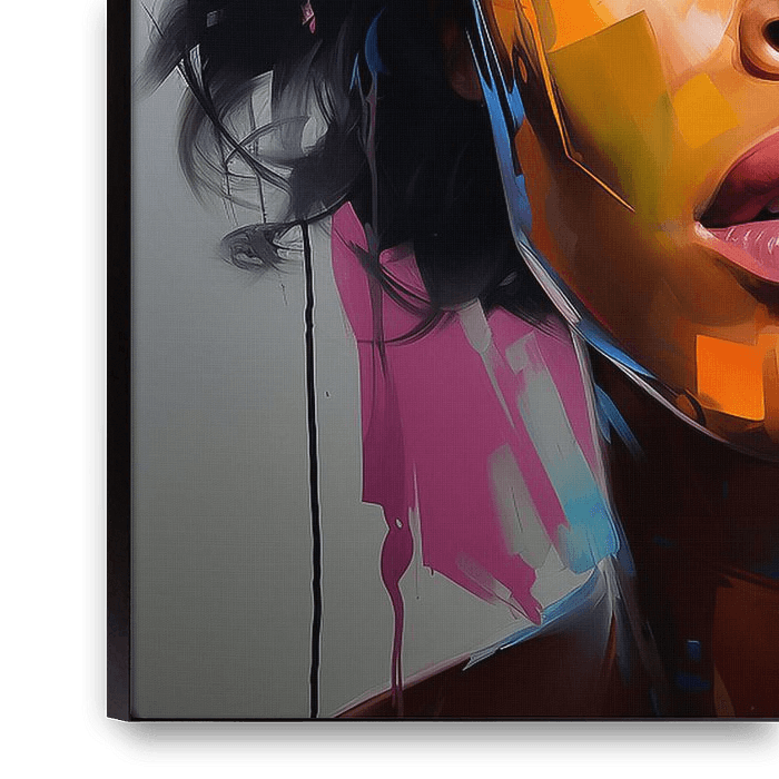 Ihr Gesicht, eine Leinwand der Emotionen, ist in leuchtende Farbe getaucht und zelebriert ausdrucksstark ihre Individualität. Jeder Pinselstrich scheint eine Geschichte zu erzählen, eine Reise voller Freude, Trauer, Liebe und Reflexion.