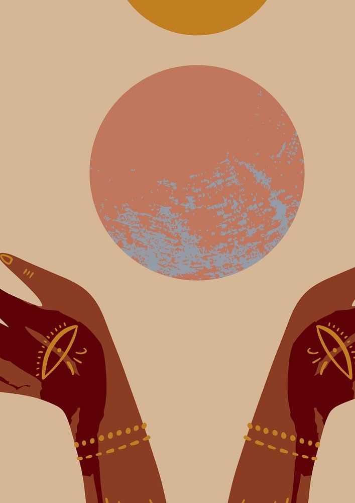 Illustration "Tag der Erde" in Erdtönen. Offene Hände mit einem Planeten und einem Mond. Bohème-Stil.