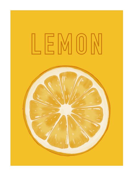Bestelle das digitale Kunst Bild Illustration einer Zitronenscheibe mit den saftigen Scheiben auf einem gelben Hintergrund, schön für in der Küche von UMA Digital NL als Reproduktion auf Leinwand, Alu-Dibond, als Poster, Fototapete oder Acrylglasbild.