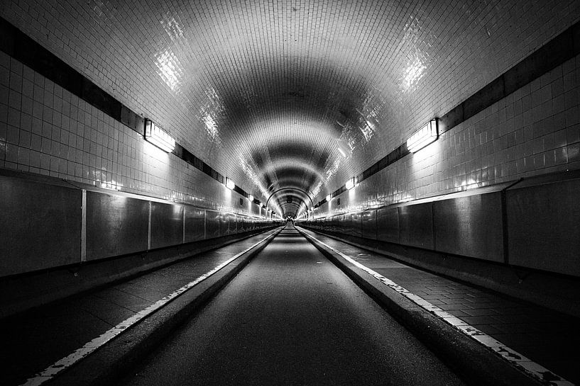 Der Elbtunnel in Hamburg erscheint in dieser Schwarz-Weiß-Fotografie als eindrucksvolle Komposition aus Symmetrie, Linien und Raum. Die perspektivisch zulaufenden Wände und Deckenstrukturen führen den Blick in die Tiefe und erzeugen eine starke visuelle Dynamik. Die reduzierte, monochrome Darstellung hebt die architektonischen Details…