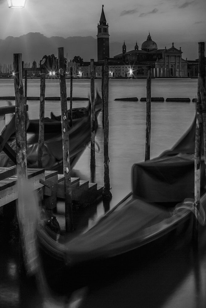 Inmitten einer Lagune wurde Venedig auf mehr als 100 Inseln erbaut. Diese Inseln sind durch über 400 Brücken miteinander verbunden, mehr als 150 Kanäle dienen als Straßen. San Giorgio Maggiore ist eine Insel in der Lagune von Venedig. Die Benediktiner-Abtei und Kirche auf der Insel tragen den gleichen Namen. Traumhafte Morgenstimmung zum Sonnenaufgang in schwarz-weiß. Die Gondeln wiegen sich im Wasser des Canale di San Marco. Fantastisches Stadtmotiv aus einer Serie weiterer urbanen Impressionen.