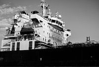 Der Hafen rau und imposant die großen Schiffe, die an Kais und Bojen festgemacht haben. Tanker und Massengutfrachter aus der ganzen Welt. Auf dem Weg zum Hafen mit ihren verschiedenen Ladungen. Dieses eindrucksvolle Schwarz-Weiß-Foto an einem ruhigen Morgen. Die Rohheit des Schiffes, die Flecken auf dem…