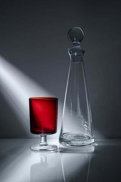 Eine diagonale Linie als Ergebnis des Zusammenspiels von Licht und Schatten mit Reflexion, wodurch ein Dreieck aus Licht entsteht. An der Spitze des Dreiecks befindet sich das Motiv: ein vintage rotes Glas neben einer Karaffe, teils im Licht, teils im Schatten.
