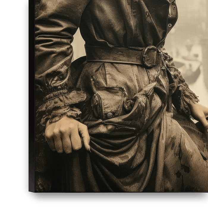 Dieses Porträt zeigt eine junge Frau, die inmitten einer nebligen, historischen Stadtlandschaft steht. Ihr Ausdruck ist ruhig und aufmerksam, als ob sie die Umgebung intensiv wahrnimmt oder sich auf eine bevorstehende Entscheidung vorbereitet. Der Nebel, der die Stadt umhüllt, verleiht der Szene eine mystische und gleichzeitig…
