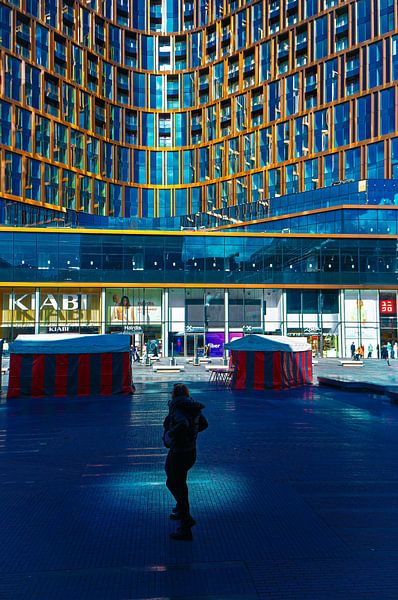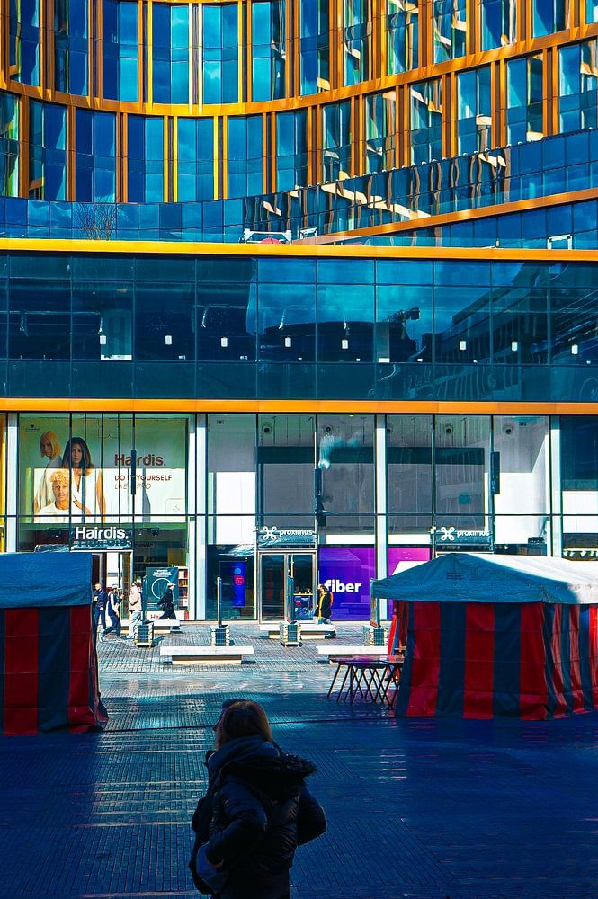Dieses architektonische Stadtfoto, aufgenommen im Herzen von Brüssel am „The Mint“ auf dem Muntplein, fängt die moderne Dynamik der Hauptstadt in einem einzigen ausdrucksstarken Bild ein. Die wellenförmige Glasfassade reflektiert das Winterlicht und erzeugt ein faszinierendes Spiel aus blauen und goldenen Farbtönen, während die einsame…