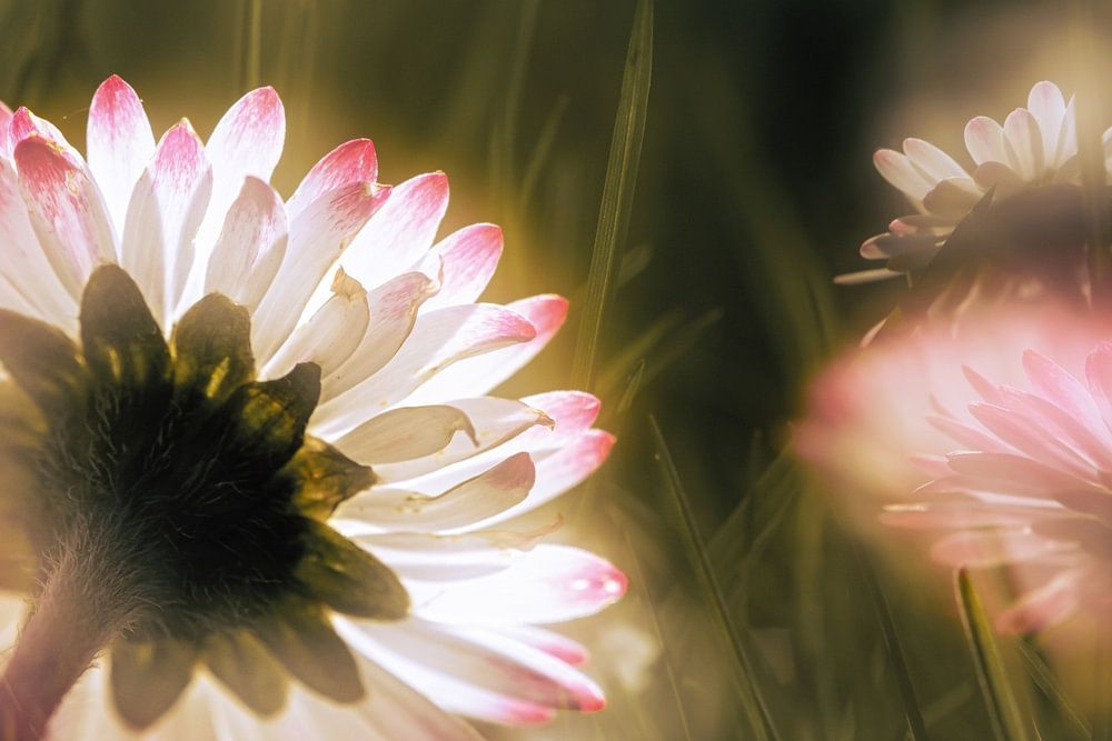 Bezaubernde Naturfotografie von den Gänseblümchen. Die feingliedrigen, zarten Blüten werden von der Frühlingssonne umtanzt und umschmeichelt. Durch die Kombination von Schärfe und Unschärfe sowie der Aufnahmetechnik Mehrfachbelichtung innerhalb der Kamera erhält das Bild sein märchenhaftes Aussehen.