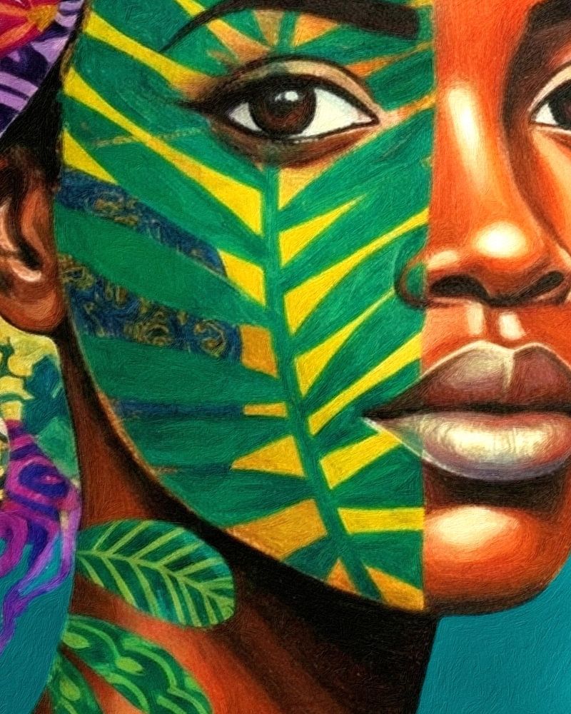 Dieses lebendige und farbenfrohe Kunstwerk ist ein beeindruckendes modernes Porträt einer afro-karibischen Frau. Ihr halbes Gesicht und ihr Hals sind kunstvoll mit Mustern aus üppigen grünen Blättern verziert, die eine…