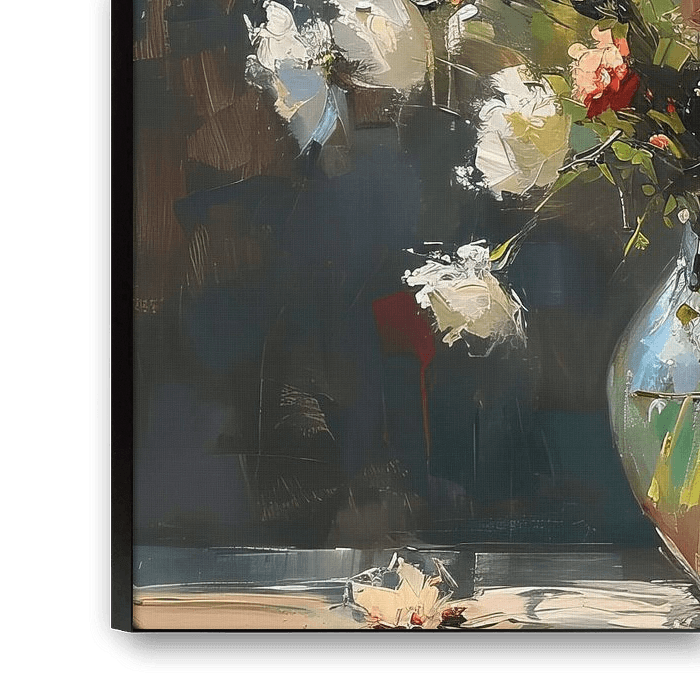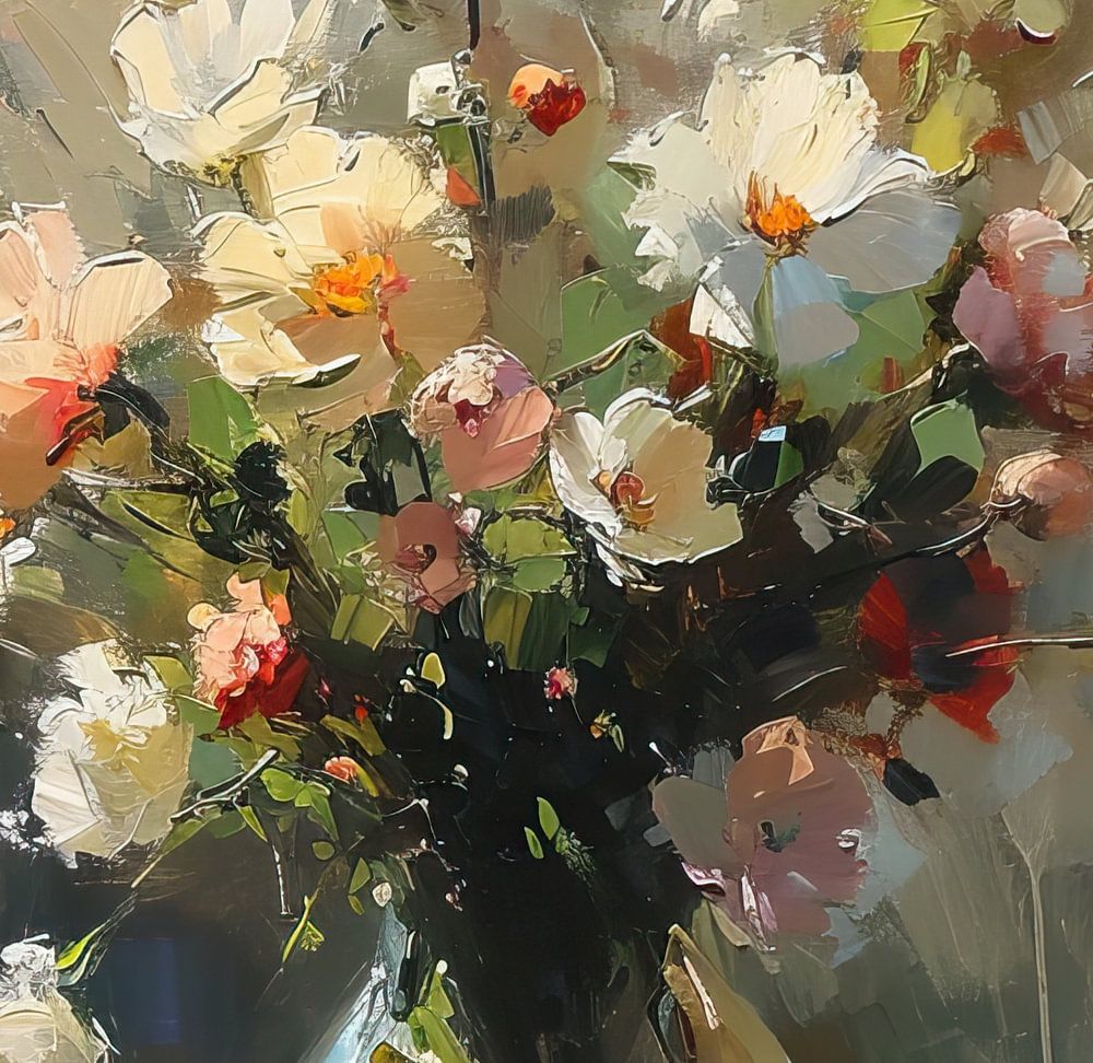 Impressionistische Blumen | Blumensymphonie - Hier sehen Sie eine lebendige Komposition verschiedener Blumen in einer transparenten Vase, vermutlich vor einem neutralen Hintergrund. Die lockeren, impressionistischen Pinselstriche erwecken die Blumen mit einem Wirbelwind von Farben zum Leben, die von zarten Pastelltönen bis zu tiefen, erdigen Brauntönen reichen. Die Reflexionen in der Vase verleihen dem Werk eine zusätzliche Ebene von Realismus und Tiefe.
