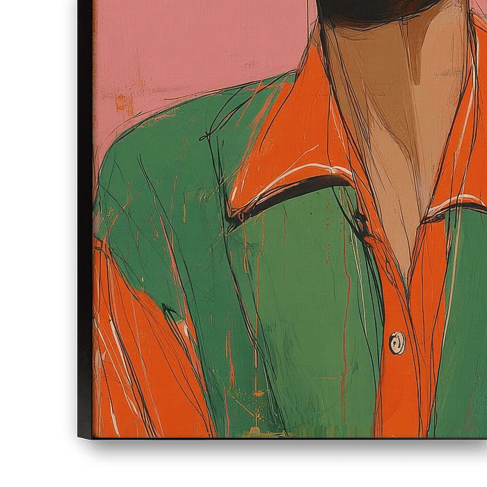 Dieses stilisierte Porträt zeigt eine Frau mit hochgestecktem, lockerem Dutt und geschlossenen Augen. Große, runde, cremefarbene Ohrringe setzen einen markanten Akzent. Sie trägt ein grünes Hemd mit orangefarbenen Details an Kragen und Ärmeln, halbgeknöpft, mit locker hochgekrempelten Ärmeln. Der Hintergrund ist ein einheitliches, pastelliges Rosa mit sichtbaren Pinselstrichen, das die zentrale Figur plakativ hervorhebt. Die lockere, expressive Malweise mit sichtbaren Pinselstrichen und Farbmischungen verleiht Tiefe, Bewegung und moderne Ästhetik. Die Komposition ist zentriert, wodurch die Frau zum klaren Fokus des Bildes wird.