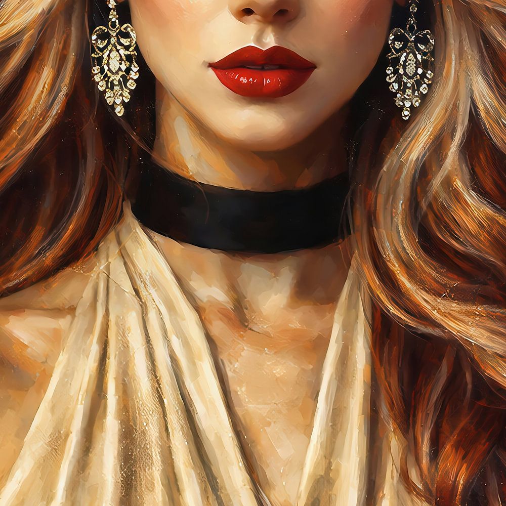 Dieses Porträt strahlt zeitlose Eleganz aus, die Stärke und Raffinesse nahtlos miteinander verbindet. Der intensive Blick zieht den Betrachter an, während warme Erdtöne und tiefe Rot-Schwarz-Kontraste eine Atmosphäre des Geheimnisses und des inneren Feuers hervorrufen. Der weiche Glanz von Haut und Stoff steht im Kontrast zu den rauen,…