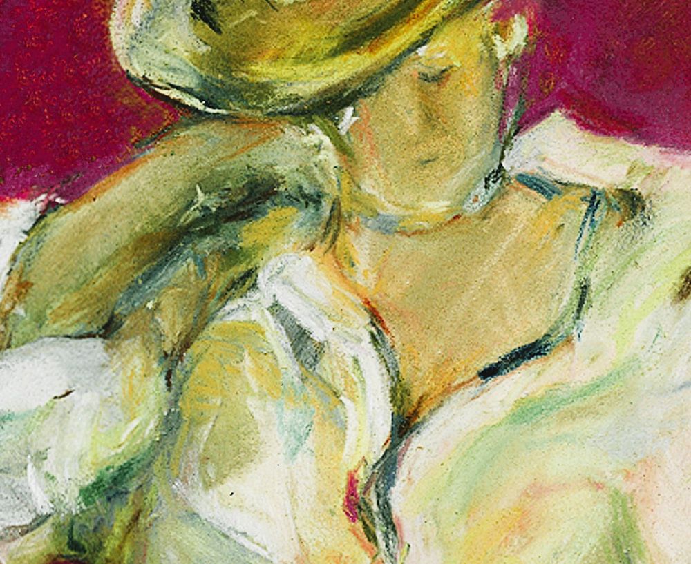 Pastellkreidezeichnung eines Mannes, der in Ruhe liest. Sein Kopf stützt sich auf seine Hand, die auf der Sitzfläche des Sofas ruht. Sein Strohhut verdeckt sein Gesicht. Der Hintergrund ist purpurrot gefärbt und bildet einen schönen Kontrast zu seiner weißen Kleidung.