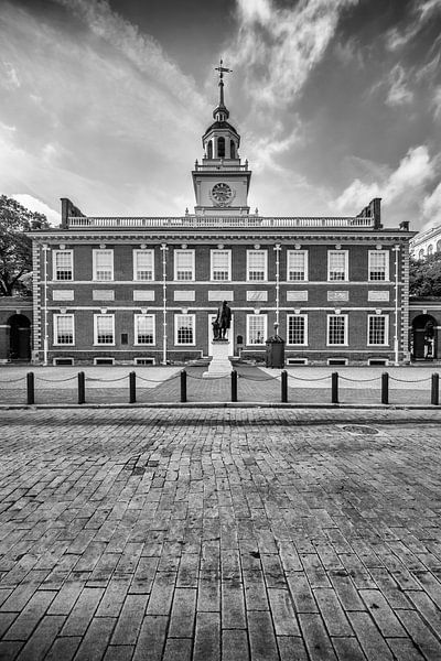 Klassisches monochromes Philadelphia Motiv mit einem der bedeutendsten historischen Bauwerke der USA in einer klaren, ausgewogenen Komposition. Die Independence Hall steht im Zentrum des Bildes und verkörpert mit ihrer symmetrischen Backsteinfassade und dem markanten Uhrturm die Ursprünge der amerikanischen Geschichte. Hier wurden die…