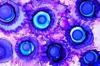 Dieses Gemälde ist ein lebendiges Beispiel für Alkohol-Tintenkunst, bei der sich die Tinte in organischen, runden Formen ausgebreitet hat. Das Werk sprüht durch die Wiederholung kreisförmiger Motive vor Energie.