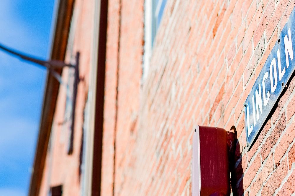 Eine Steinfassade an einem alten Gebäude in Boston, USA. An der Fassade befinden sich eine Straßenlaterne und ein Straßenschild.