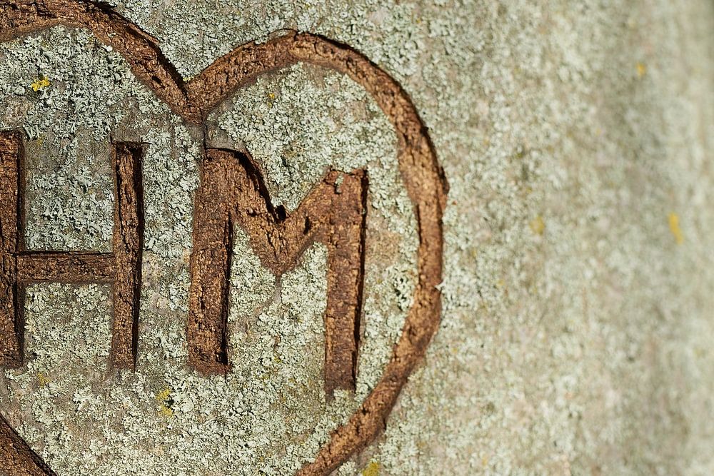 Initialen von unbekannten Verliebten mit den Anfangsbuchstaben H und M in einem Herz in der Rinde eines Baumes im Park Klosterbergegarten im Magdeburger Stadtteil Buckau.