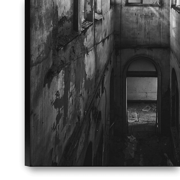 Eine schmale überdachte Gasse in einer großen verlassenen deutschen Villa.
