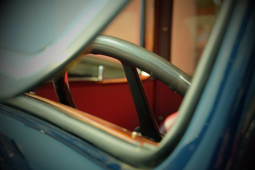 Blick auf das Lenkrad eines Oldtimers aus den 50er Jahren.