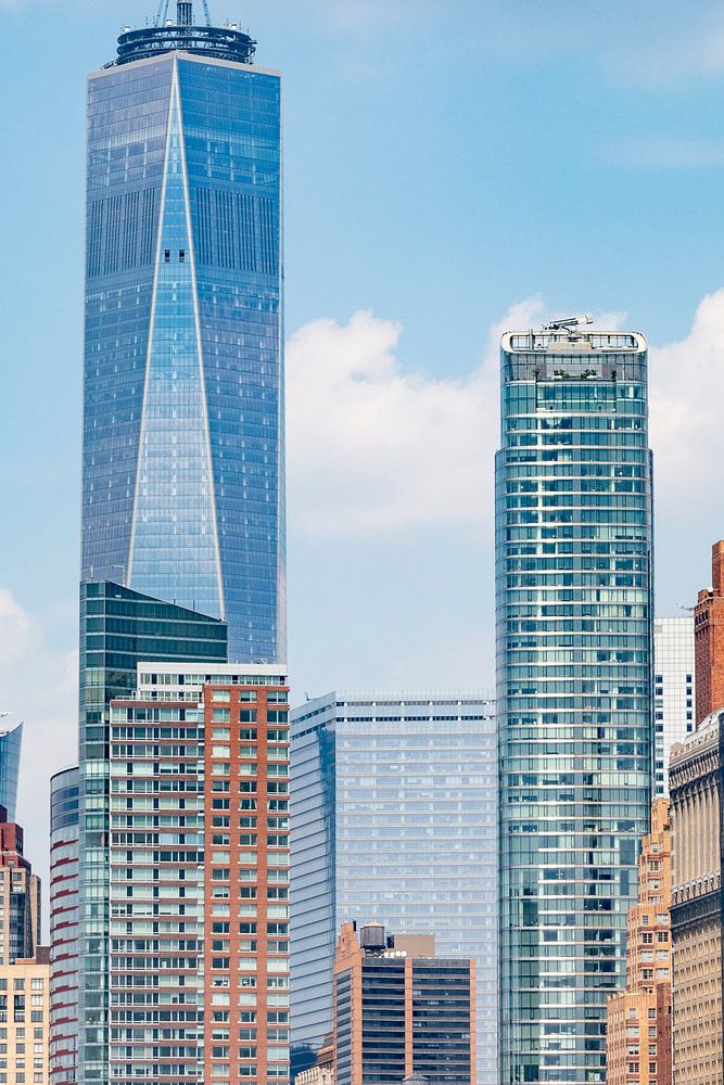 Downtown Manhattan, mit Blick auf das One World Trade Center, unter anderem. Das schöne 541 Meter hohe Gebäude, das die Skyline des südlichen Manhattans und New Yorks dominiert.