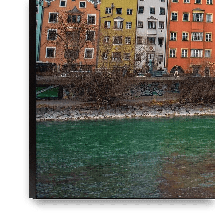 Bestelle dieses Landschafts-Wandbild Innsbruck - Blick vom Marktplatz über die Inn zur Nordkette von t.ART als Reproduktion auf Leinwand, Alu-Dibond, als Poster, Fototapete oder Acrylglasbild.
