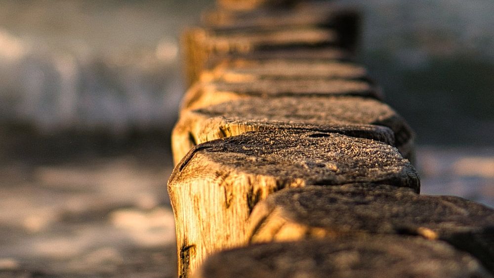 Ins Meer ragende Buhnen. Aufgenommen in Zingst, auf dem Darß. Die Perspektive ist auf den Horizont gerichtet.