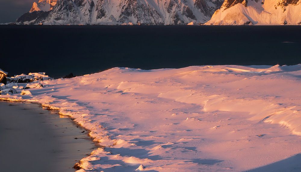 Die schneebedeckte Insel Mosken mit dem Lofoten-Archipel im Hintergrund bei Sonnenuntergang, Norwegen