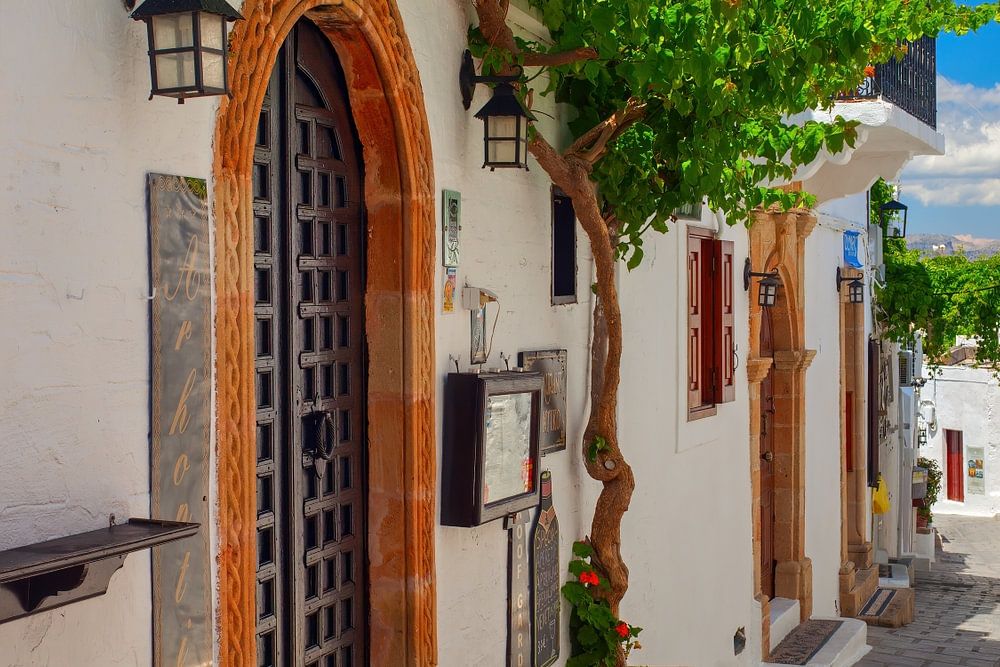 Restaurant Apxontiko in der engen Gasse der schönen antiken Stadt Lindos. Insel Rhodos, Griechenland.
