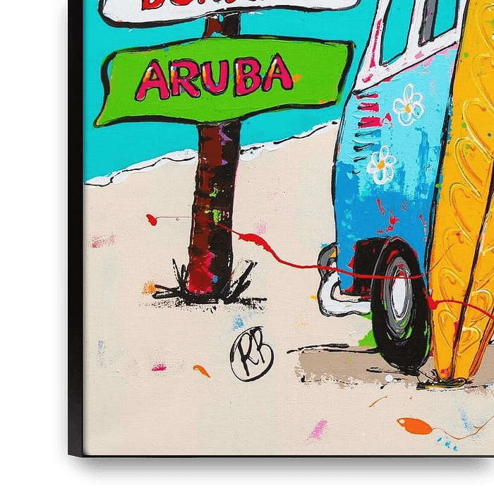 Bestelle dieses Popart-Wandbild Inselhüpfer VW-Bus von Happy Paintings / Renata Rolefes als Reproduktion auf Leinwand, Alu-Dibond, als Poster, Fototapete oder Acrylglasbild.
