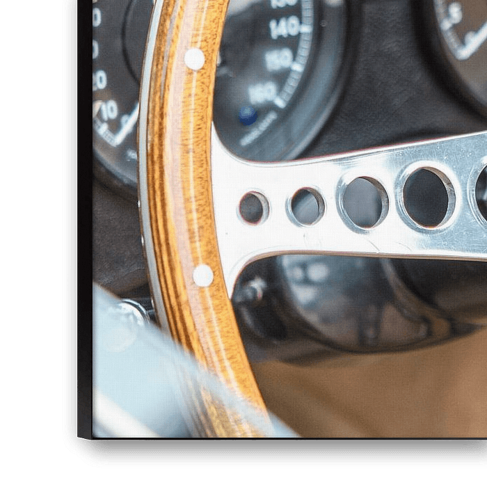 Interieur auf einem Jaguar E-Type Roadster oder Jaguar XK-E 1960er Jahre Cabrio-Sportwagen Vorderansicht. Der E-Typ ist ein legendärer britischer Sportwagen, der von 1961 bis 1975 von Jaguar produziert wurde und als Coupé oder Cabriolet erhältlich war.