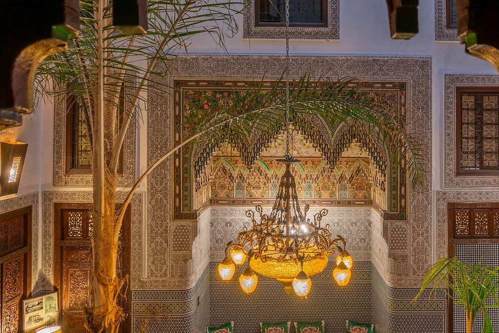Blick durch ein Fenster in das Innere des Riad Al Makan in Fes. In der Nähe der Medina von Fes können Sie sich entspannen, ohne von den Geräuschen draußen gestört zu werden. Das Konzept eines Riads konzentriert sich auf Privatsphäre und Schutz vor dem Wetter. Das Gebäude ist um ein Atrium herum gebaut und hat in der Regel zwei Stockwerke. Um diesen Innenhof herum befindet sich oft auf jeder Etage eine Galerie. Die Zimmer sind um das Atrium herum gruppiert. Die Wände sind mit Tadelaktputz, zelligem Mosaik und/oder islamischer Kalligrafie bedeckt. Der Innenhof ist oft mit Pflanzen, Bäumen und einem Springbrunnen ausgestattet. Die Außenwände des Riads haben nur kleine Fenster. Der Grundriss eines Riads ist von dem der römischen Villa abgeleitet. Das erste Riad wurde wahrscheinlich im 9. oder 10. Jahrhundert in der Stadt Volubilis gebaut. Die ursprünglich römische Stadt wurde damals von den islamistischen Idrisiden regiert. Als die Almoraviden im 11. Jahrhundert Spanien eroberten, wurden viele Künstler (oft Juden oder Christen) nach Marokko geschickt, um Paläste und Riads zu schmücken. Viele Riads in Marrakesch, Fes und Essaouira werden heute als Hotels oder Restaurants genutzt.