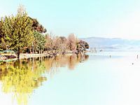 Eine ruhige Szene entlang des Seeufers in Castiglione del Lago in Umbrien, Italien, mit Blick auf die Inseln. Dieses Fotokunstbild, Lakeside Interpretation, zeigt herbstliche Spiegelungen im See.