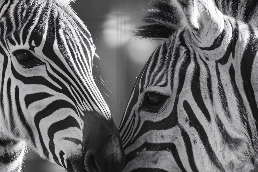 Dieses wunderschöne Schwarz-Weiß-Foto zeigt zwei Zebras in einem intimen und liebevollen Moment. Ihre Schnauzen berühren sich sanft und strahlen ein Gefühl der Verbundenheit und Zärtlichkeit aus. Dieses Foto mit seinen scharfen Kontrasten und detaillierten Mustern fängt die Essenz der natürlichen Schönheit und der komplexen Beziehungen im Tierreich ein. Die monochrome Farbgebung verleiht dem Bild eine zeitlose Qualität und macht es zu einer perfekten Ergänzung für jede moderne Einrichtung, insbesondere in einem Büro, wo ein beruhigendes und inspirierendes Bild willkommen ist. Dieses Bild ist eine Ode an die Einfachheit und die Kraft der Natur, ideal für Liebhaber von Tierfotografie und Kunst mit einer emotionalen Aufladung.