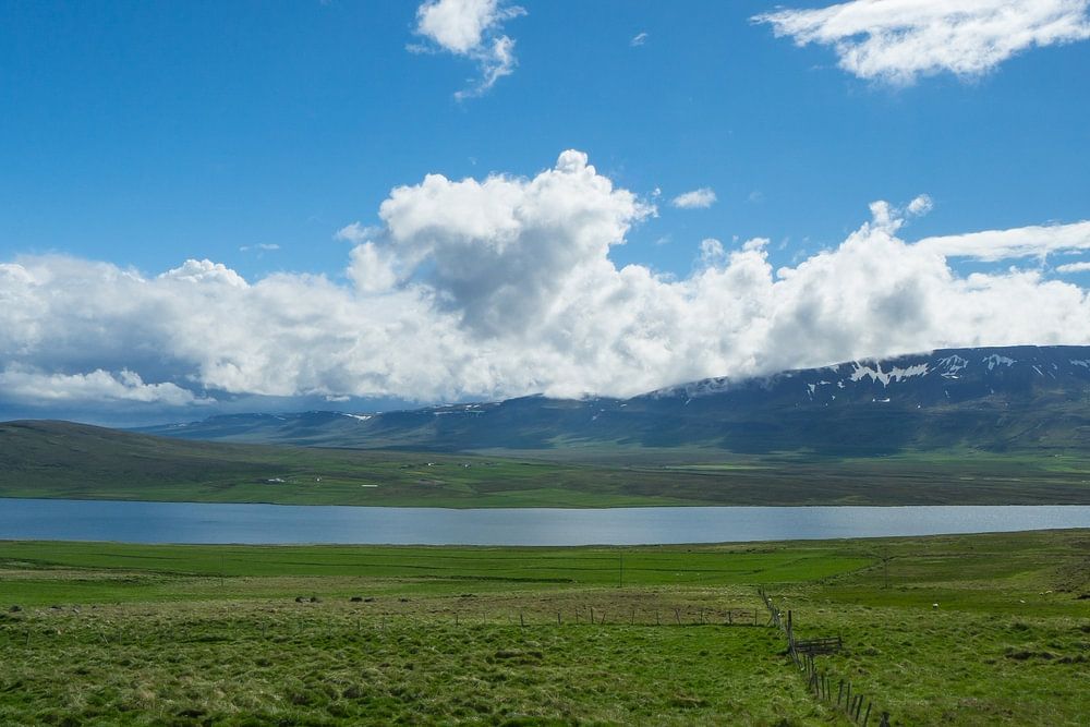 Island - Fjord und Berge mit Schnee hinter weiten grünen Feldern