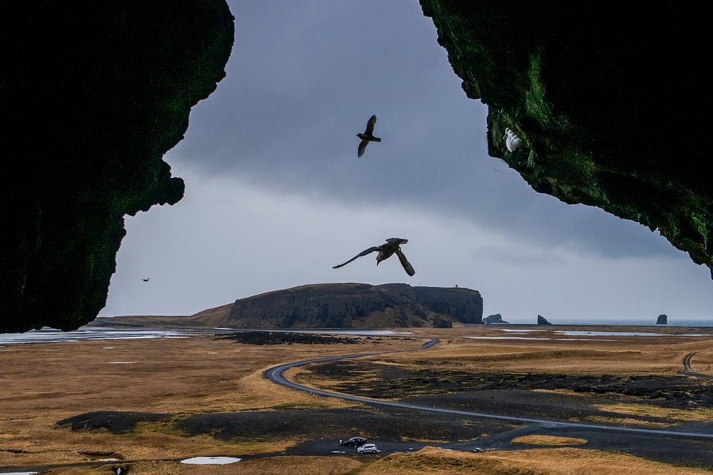 Ein sehr schöner Überblick von dieser Höhle in Island. Die Landzunge, die Sie hier sehen, heißt Dyrholaey. Der Name der Höhle ist Loftsalahellir und ist Unterschlupf für viele Vögel. Schauen Sie genau hin, damit Sie das Meer in der Ferne sehen können. Das Meer bricht gegen die Klippen.