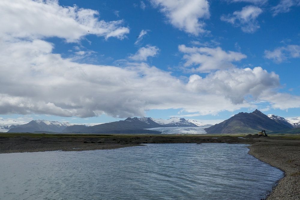 Island - Zwei Gletscher hinter Fluss in bergigen vulkanischen Land, Weitwinkel Natur Landschaft Panorama-Ansicht