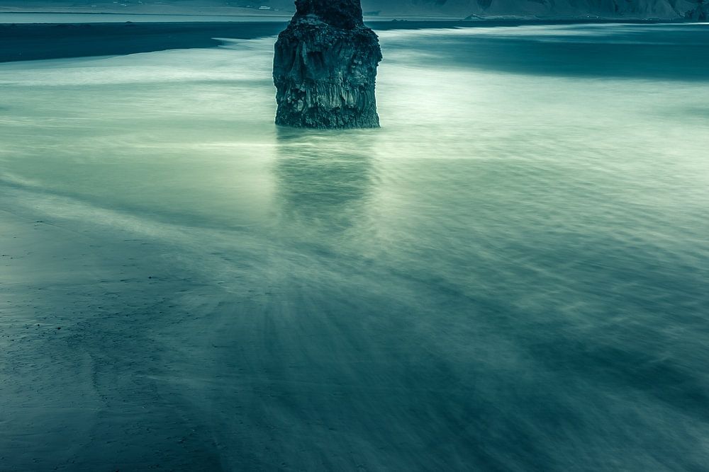 Die Nacht bricht über Island in der Nähe des schwarzen Strandes von Vik herein. Ein Abend mit schweren Wolken, die eine düstere Atmosphäre wie im Film Der Herr der Ringe verbreiten.