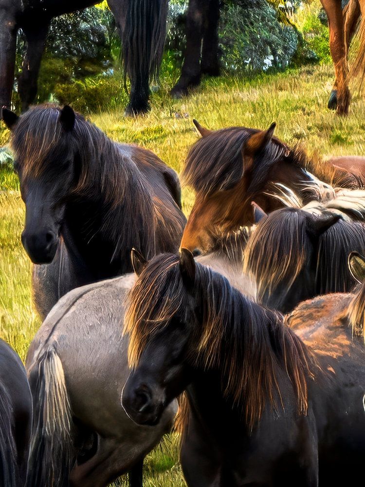 Islandpferde sind ein einzigartiger und ikonischer Teil der isländischen Landschaft. Klein von Statur, aber stark und robust, haben sie sich über Jahrhunderte an das raue Klima und die schroffe Natur angepasst. Dieses Foto zeigt eine Herde in ihrem natürlichen Lebensraum. Sie grasen und bewegen sich über das offene Grasland, das von moosbedeckten Felsen umgeben ist. Ihre dicken Mähnen und vollen Schwänze wehen sanft im Wind, während die verschiedenen Farben ihres Fells - von tiefschwarz über kastanienbraun bis hellgrau - einen schönen Kontrast zur grünen Landschaft bilden.