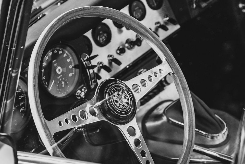 Jaguar E-Type 3.8 Series I FHC klassischer britischer Sportwageninnenraum in Schwarz-Weiß. Jaguar E-Type, oder der Jaguar XK-E wurde von Jaguar Cars Ltd. zwischen 1961 und 1975 als Grand-Tourer mit Heckantrieb im zweisitzigen Coupé (FHC oder Fixed Head Coupé) und Roadster hergestellt.