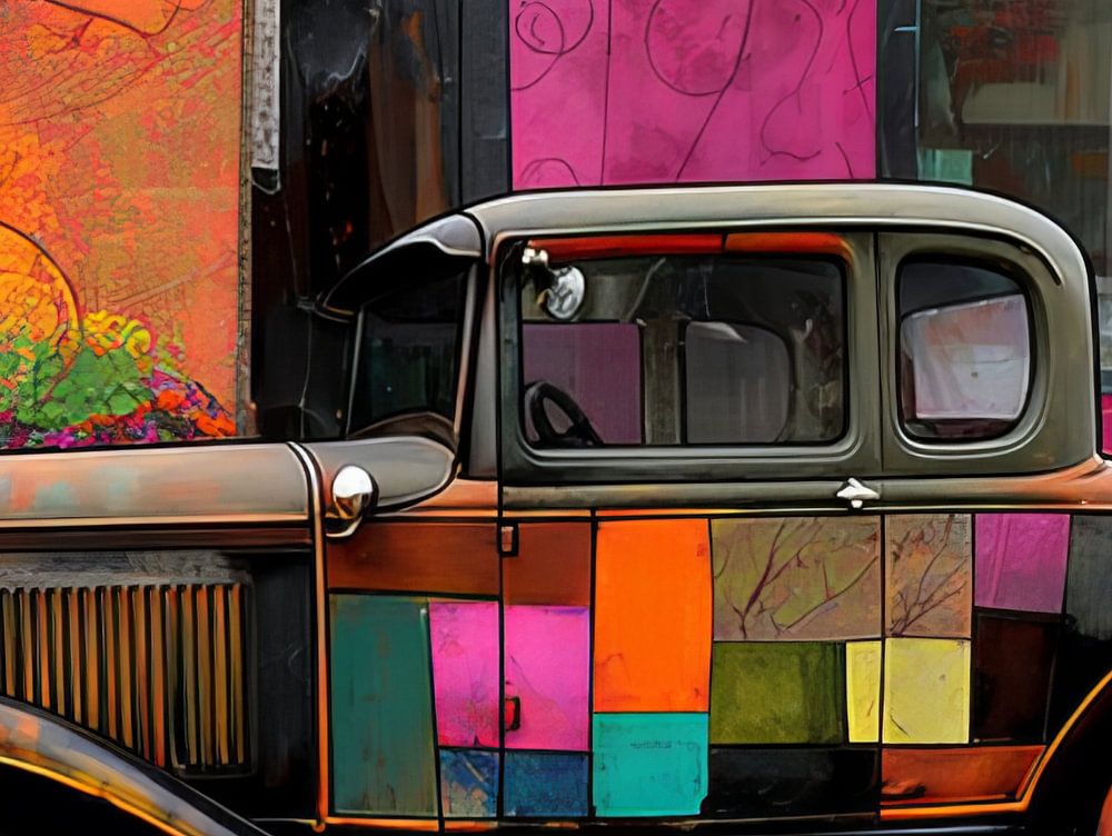 Ein Bild im Boho-Stil von einem alten Jalopy in Patchwork gemalt, vor einem Geschäft. Ein lustiges und fröhliches Geschenk, um den Tag eines jeden zu erhellen oder eine Ecke in Ihrem Haus!
