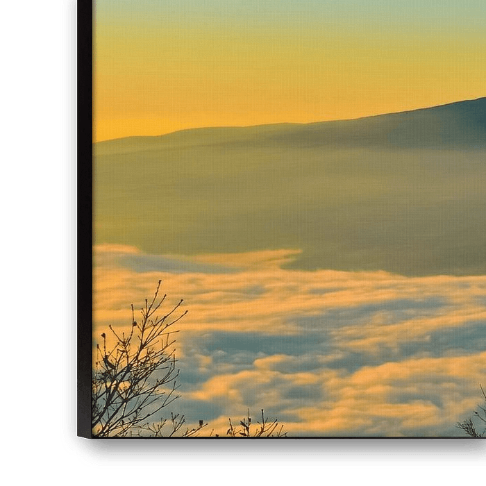 Eine atmosphärische Fotografie von Mt. Fuji in Japan bei Sonnenaufgang. Die Wolken unter dem hohen Gipfel des Vulkans sind sichtbar und machen das Bild sehr heiter. Wunderbar für Großformat im Wohnzimmer oder Büro.