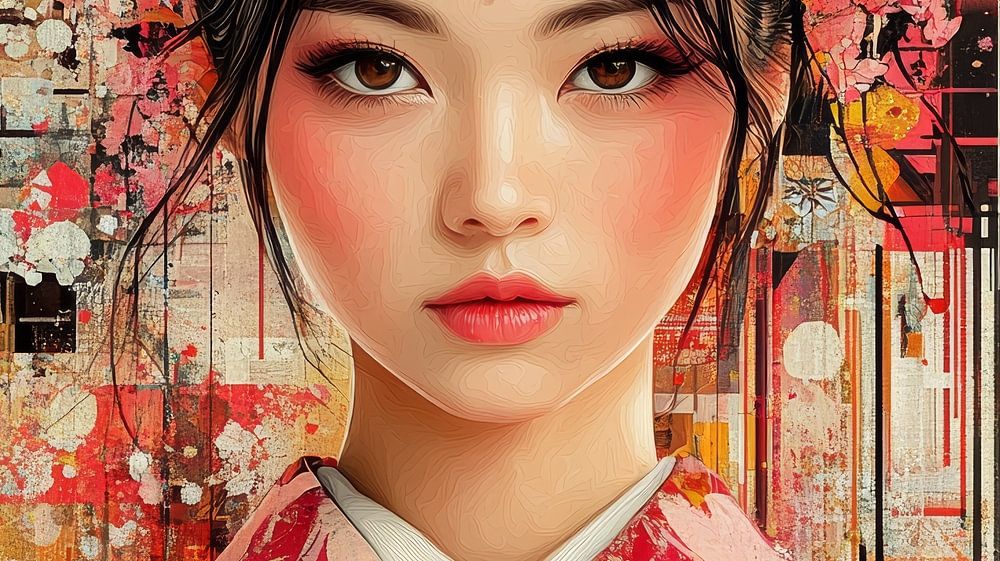 Das Bild zeigt eine junge Frau mit langen schwarzen Haaren, die einen traditionellen japanischen Kimono trägt. Der Kimono hat eine leuchtend rote Farbe mit komplizierten Blumenmustern und goldenen Akzenten. Ihr Haar ist mit roten Blumen geschmückt, und ihr Make-up ist kräftig und auffallend, mit roten Lippen und braunem Lidschatten. Der Hintergrund ist eine Unschärfe aus Rot, Weiß und Gold, die ein Gefühl von Bewegung und Energie vermittelt.