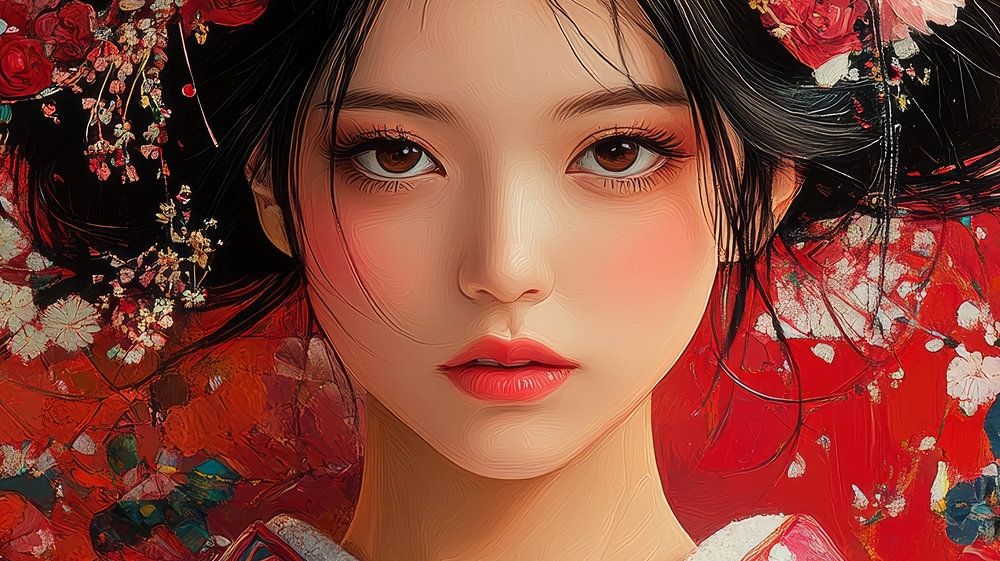 Das Bild zeigt eine junge Frau mit langen schwarzen Haaren, die einen traditionellen japanischen Kimono trägt. Der Kimono hat eine leuchtend rote Farbe mit komplizierten Blumenmustern und goldenen Akzenten. Ihr Haar ist mit roten Blumen geschmückt, und ihr Make-up ist kräftig und auffallend, mit roten Lippen und braunem Lidschatten. Der Hintergrund ist eine Unschärfe aus Rot, Weiß und Gold, die ein Gefühl von Bewegung und Energie vermittelt.