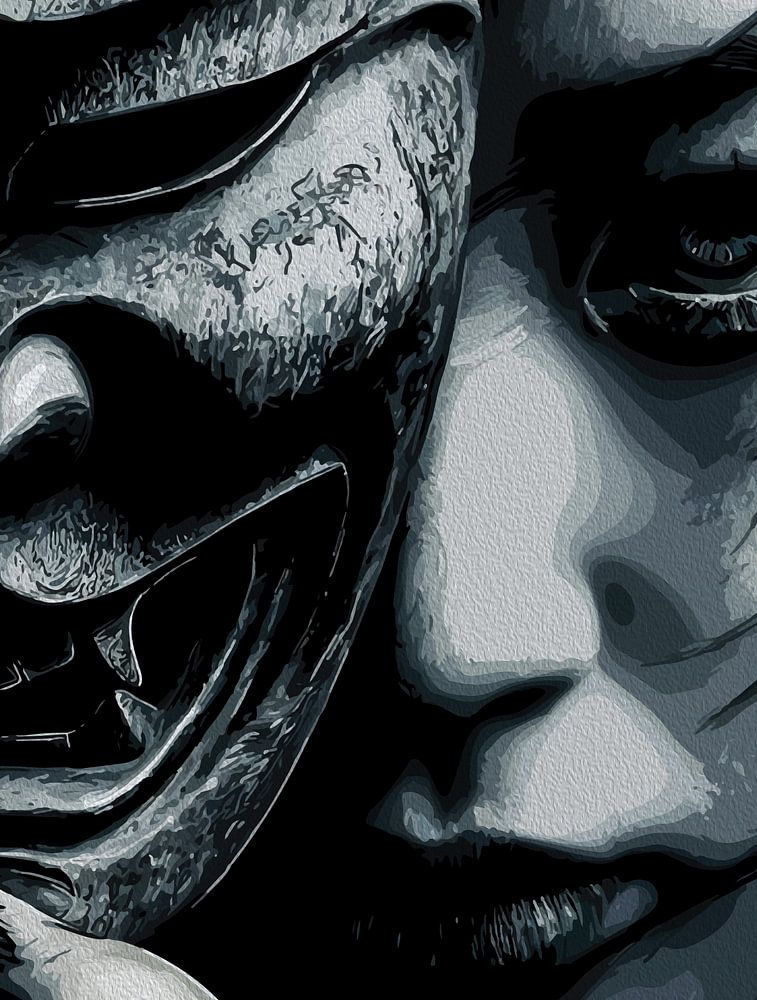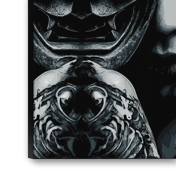 Setzen Sie ein mutiges Statement mit diesem dramatischen Wandbild, das eine realistische, tätowierte Frau neben einer gespenstischen japanischen Maske zeigt. Perfekt für Liebhaber dunkler Ästhetik, moderner Porträts und einzigartiger Wohnkultur. Verschönern Sie Ihren Raum mit diesem mysteriösen, emotionalen Kunstwerk.