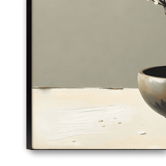 Dieses moderne Stillleben verströmt den Geist des japanischen Minimalismus und das impressionistische Spiel von Licht und Leere. Es lädt den Betrachter ein, zur Ruhe zu kommen und die Schönheit im Unvollkommenen zu sehen.